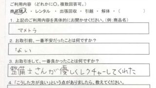 お客様の声 【商品購入】岐阜店 U.M様 ご利用内容商品購入上記のご利用内容を具体的にお聞かせください。今使用しているものが悪くなったお取引前、一番不安だったことは何ですか?正常に作動するかお取引をして、一番良かったことは何ですか?全般的にまあ~「こうした方が良い」という点がありま... 2025.07.07 お客様の声